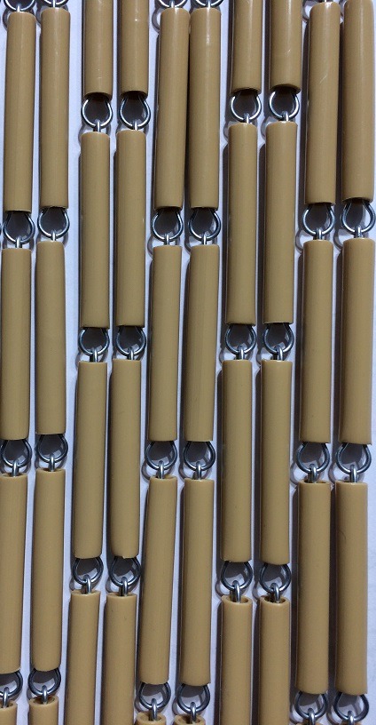 Vliegengordijn met caramel hulsjes in een recht of versprongen motief.
