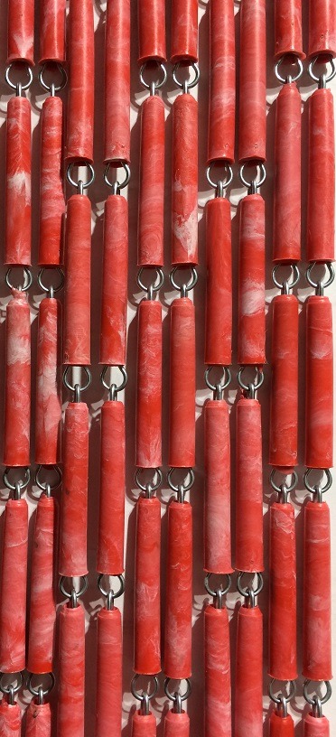 Vliegengordijn met roze gevlamde hulsjes in een recht of versprongen motief.